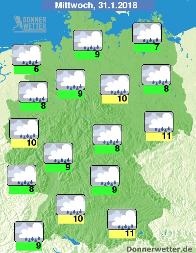 Am Mittwoch ziehen dichte Wolken über uns hinweg, dabei fällt zum Teil langanhaltender Regen, der im Norden und Nordwesten im weiteren Verlauf teils mit Schnee vermischt sein kann. Die Temperatur steigt auf 7 bis 11 Grad. An den Küsten weht ein teils stürmischer Wind.