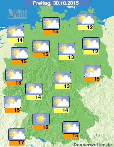 Am Freitag hält sich vor allem im Süden und entlang einiger Flusstäler noch teils zäher Nebel, sonst kann sich die Sonne jedoch zwischen den Wolken häufig zeigen und vielerorts wird es auch heiter oder sonnig. Es bleibt bundesweit trocken. Die Höchstwerte erreichen 12 Grad in Neubrandenburg und bis 17 Grad in Freiburg.