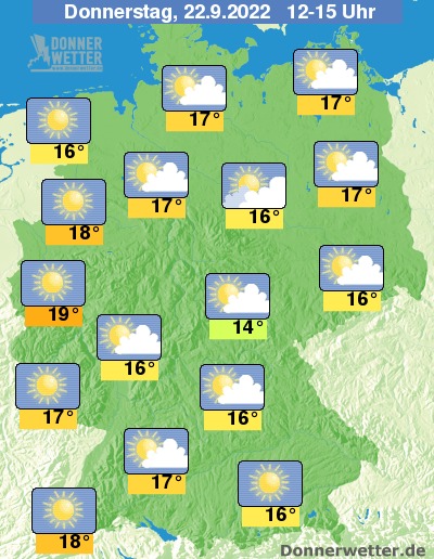 Der heutige Nachmittag zeigt sich verbreitet heiter oder sonnig. Nur lokal können auch mal mehr Wolken durchziehen. Bei 14 Grad im Vogtland und bis 19 Grad in Düsseldorf bleibt es komplett trocken.