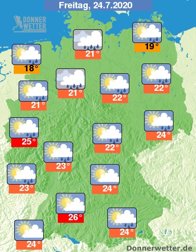 Am Freitag ist es zwar teils heiter bis sonnig, gebietsweise ziehen aber auch einige und teils dichte Wolken durch, dazu bilden sich einzelne Schauer, an den Alpen sind auch Gewitter möglich. Die Temperatur steigt auf 18 Grad in Wilhelmshaven und bis 26 Grad im Raum Stuttgart.