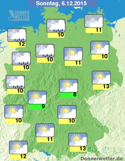 Am Sonntag bleibt es über der Nordhälfte des Landes meist bedeckt, dazu fällt im Norden zeitweise Regen, sonst ist es weitgehend trocken. Weiter nach Süden hin ist es stark oder aufgelockert bewölkt und dabei trocken. Die Temperatur steigt auf milde 9 bis 14 Grad. Im Norden und Westen ist es verbreitet stürmisch mit teils schweren Sturmböen, an der Nordsee herrscht teils schwerer Sturm, dabei sind auch Orkanböen möglich.