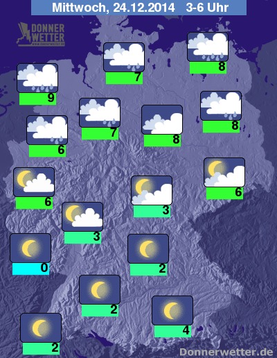 In der kommenden Nacht bleibt es im Norden weitgehend bedeckt und es fällt auch weiterhin zum Teil langanhaltender und ergiebiger Regen. In der breiten Mitte des Landes ist es verbreitet aufgelockert bis stark bewölkt, jedoch meist trocken. In den südlichen Landesteilen zeigt sich der Himmel oft sternenklar, hier bleibt es dabei natürlich trocken. In der Nordhälfte des Landes weht weiterhin frischer bis starker, in Böen und an der See teils stürmischer Wind. An der Nordsee sind einzelne orkanartige Böen möglich. Die Temperatur sinkt auf 9 Grad in Ostfriesland und bis 0 Grad im Bliesgau.