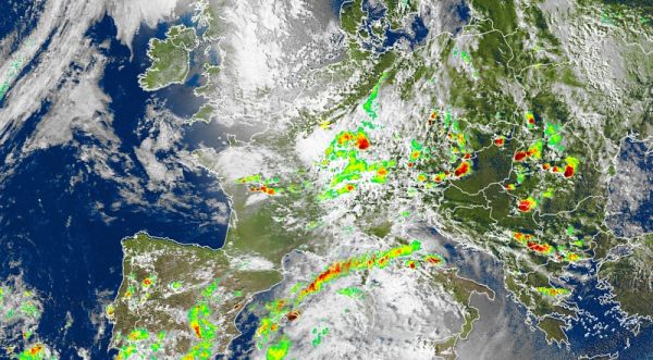 Das Satellitenbild von heute Nachmittag zeigt farbig die Regenwolken über der Mitte und dem Süden Deutschlands. Im Norden ist es schon in Kaltluft aufgelockert.