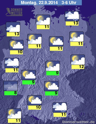 In der kommenden Nacht fällt in Alpennähe und auch am Bayerischen Wald noch zum Teil kräftiger und anhaltender Regen, sonst lockert die Bewölkung meist etwas auf, teils bleibt es auch noch stärker bewölkt, aber Schauer sind nur noch örtlich zu erwarten. Die Temperatur sinkt auf 13 Grad in Neubrandenburg und bis etwa 8 Grad am Pfälzer Wald.