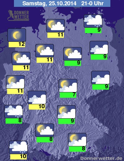 Heute Abend lockert die Bewölkung meist auf und die Niederschläge klingen meist ab, vom Nordosten über den Osten bis nach Südosten, sowie im Südwesten des Landes halten sich häufig aber noch dichte Wolken und hier und da kann auch etwas Regen fallen. Stellenweise bildet sich Nebel oder Hochnebel. Die Abendtemperatur liegt bei 12 Grad in Bremerhaven und 7 Grad am Thüringer Wald.