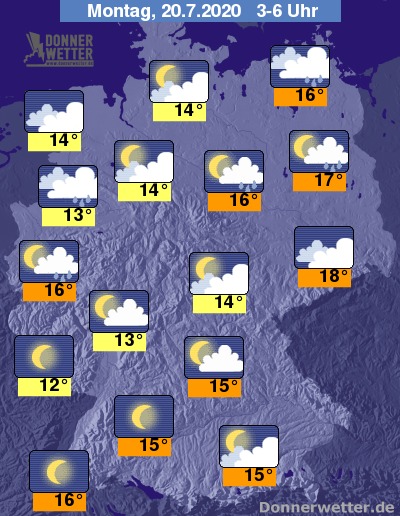 In der bevorstehenden Nacht bilden sich vor allem im Osten und Nordosten, anfangs auch im Süden und sonst nur vereinzelt Schauer. Im Südwesten ist es häufig sternenklar, sonst jedoch meist wechselnd bis stark bewölkt. Die Temperatur sinkt auf 18 Grad in Dresden und bis 12 Grad im Saargau.