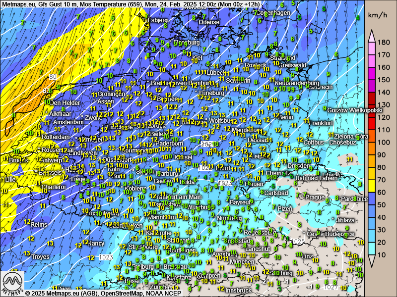 Im Tagesverlauf steigen die Temperaturen verbreitet auf über 10 Grad C und es ist bis zum Mittag noch schön. Im Nordwesten starker Wind, Niederlande und Nordsee auch Sturmböen und auch erster Regen.