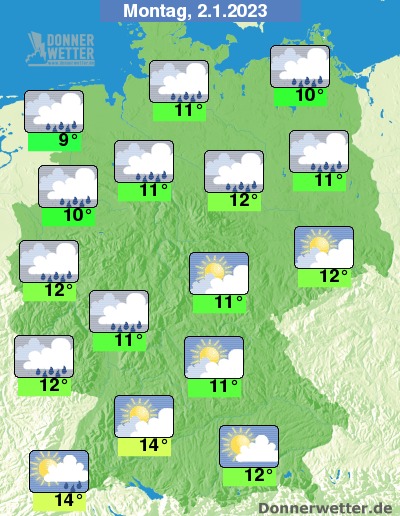 Am Montag ist es über der Nordwesthälfte Deutschlands bedeckt und es fällt dabei zeitweise Regen. Im Südosten ist es hingegen teilweise locker, sonst mehrheitlich stark bis dicht bewölkt, dabei bleibt es trocken. Die Temperatur erreicht 9 Grad in Wilhelmshaven und bis 14 Grad in Stuttgart.