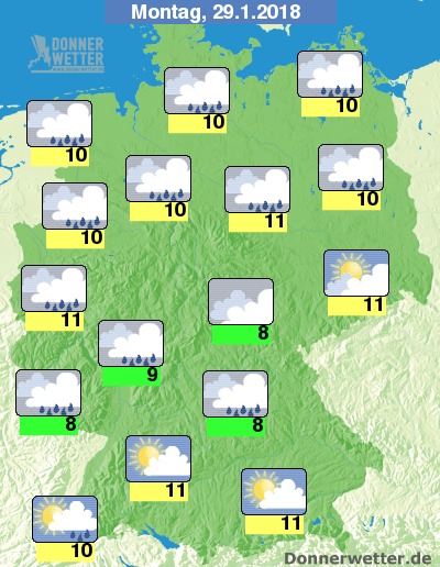 Ganz im Süden besteht die größte Hoffnung auf Sonne. Sonst bleibt der Himmel abgesehen einiger Auflockerungen von einer dichten grauen Wolkenschicht überzogen, dabei fällt zunächst aber nur vereinzelt etwas Regen oder Sprühregen. Zum Nachmittag zieht von Nordwesten eine intensivere Regenzone auf. Diese überquert den Norden und die Mitte und erreicht in der Nacht auf Dienstag unter Abschwächung auch das nördliche Baden-Württemberg und Bayern. Die Höchsttemperaturen liegen deutschlandweit zwischen milden 7 und 12 Grad. Der Wind bläst vor allem im Norden und in der Mitte frisch bis stark, im Süden weht er meistens nur schwach bis mäßig.