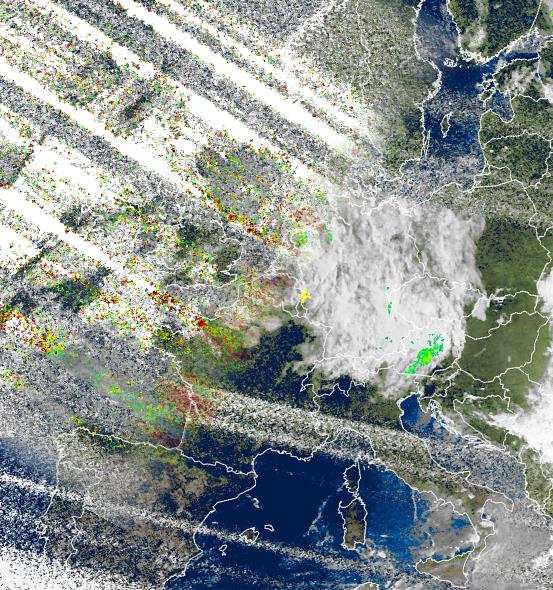 Auf dem Satellitenfoto von heute Morgen zeigt sich vor allem die Südhälfte von Europa verbreitet heiter oder auch wolkenlos. Über dem Bundesgebiet und z.B. auch über den Alpen hielt sich zu der Zeit dagegen eine kompakte Wolkendecke aus der in weiten Landesteilen auch gebietsweise Regen fiel.