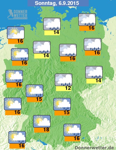 Am Sonntag sind besonders in Süddeutschland zwischen einigen Wolken häufige Aufheiterungen möglich, dabei fällt hier nur vereinzelt etwas Regen. Im großen Rest des Landes zieht hingegen oft starke Bewölkung durch, wobei auch Auflockerungen möglich sind, es können sich jedoch wiederholt Schauer und auch einzelne Gewitter bilden. Dazu weht ein verbreitet frischer bis starker, an der See auch stürmischer Wind. Die Temperatur steigt auf nur 12 Grad in Eisenach und bis 18 Grad in Stuttgart.