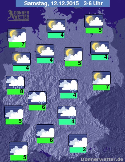 Am Samstag fällt zunächst in einem breiten Streifen von Rheinland-Pfalz, über das nördliche Baden-Württemberg und die Nordhälfte Bayerns zeitweise Regen oder Sprühregen, sonst ist es bei teils starker, teils aufgelockerter Bewölkung weitgehend trocken. Im Nachmittagsverlauf ziehen jedoch in den westlichsten Landesteilen neue Wolken mit Regen auf, sonst bleibt es weiterhin weitgehend trocken. Die Temperatur steigt auf 5 Grad im Eichsfeld und bis 9 Grad im Rheinland. An der Ostsee weht teils starker Wind.