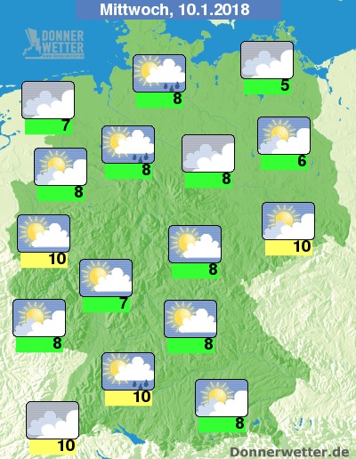 Am Mittwoch ist es vor allem im Süden oft heiter, teils aber auch stark bewölkt, jedoch überwiegend trocken, sonst ist es teils trüb, teils aufgelockert bewölkt, dabei bleibt es ebenfalls zum Großteil trocken. Die Temperatur steigt auf 5 bis 10 Grad.