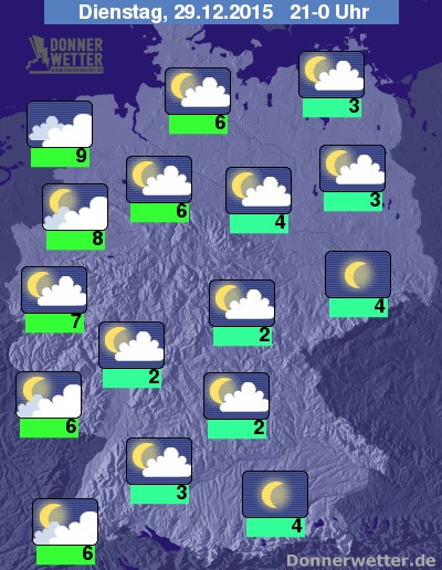 In der Nacht zum Mittwoch ist es mal locker, mal aufgelockert bewölkt, im Westen und Südwesten klart der Himmel verbreitet auf. Es bleibt landesweit trocken bei Tiefstwerten von 7 Grad an der Nordsee und bis 0 Grad im Vogtland. Im Südwesten bildet sich gebietsweise Nebel oder Hochnebel. An der Ostsee weht teils starker Wind.