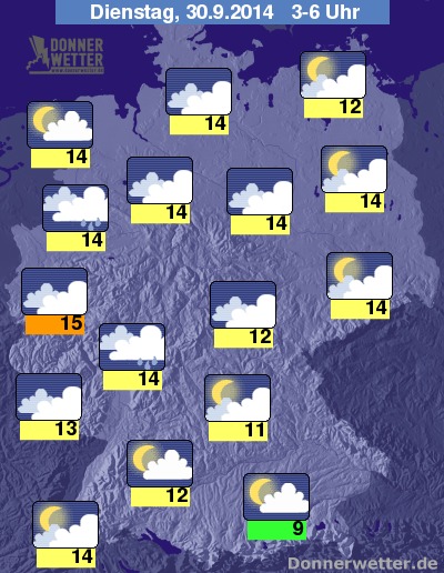 In der Nacht zum Dienstag ziehen im Westen und Norden zeitweise dichte Wolken durch, dabei fällt vor allem im Norden gebietsweise Regen, sonst bleibt der Himmel meist aufgelockert bewölkt, dabei bleibt es trocken. Die Temperatur sinkt auf 15 Grad in der Kölner Bucht und bis 9 Grad im Allgäu.