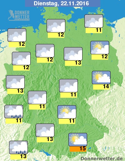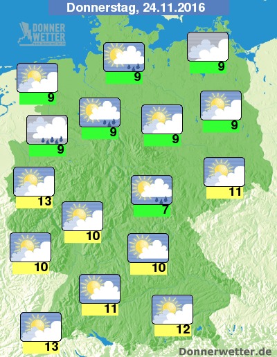 Am Donnerstag zeigt sich der Himmel mal wechselnd, mal stark bewölkt; auch heitere Phasen sind im Tagesverlauf zu erwarten. Schauer fallen vorwiegend entlang der Weser, sonst bleibt es meist trocken. Die Temperaturen erreichen in der Nordhälfte Werte um 7 bis 9 Grad C, im Süden um 10 bis 13 Grad C.