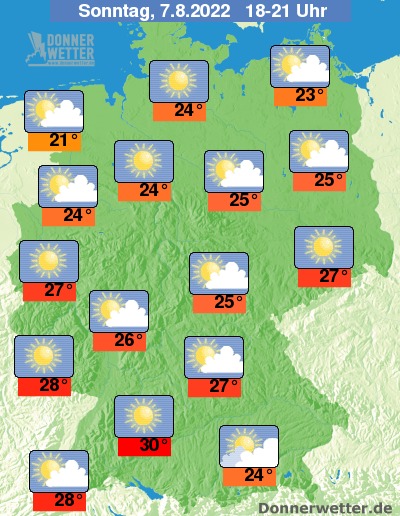 Heute Abend ist es überwiegend heiter bis sonnig, lediglich an den Alpen halten sich zum Teil viele, meist jedoch aufgelockerte Wolken. Es bleibt trocken bei 21 Grad in Cuxhaven und bis zu 30 Grad in Stuttgart.