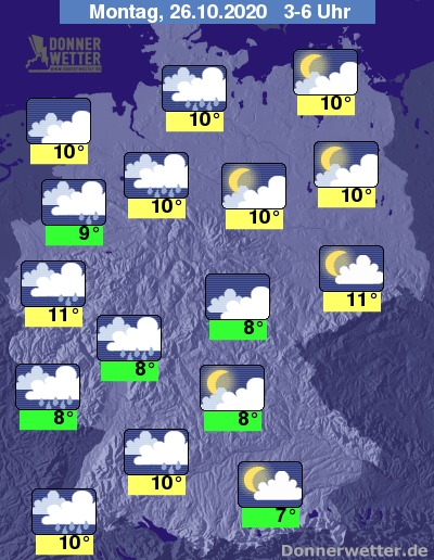 In der Nacht zum Montag breitet sich der Regen etwa auf die komplette Westhälfte Deutschlands aus, dabei bleibt es bedeckt. Weiter nach Osten hin ist es oft aufgelockert, zunehmend aber auch stark bewölkt, aber es bleibt noch weitgehend trocken. Stellenweise bidlet sich Nebel. Die Temperatur sinkt auf 11 Grad im Rheinland und bis 7 Grad in Oberbayern.