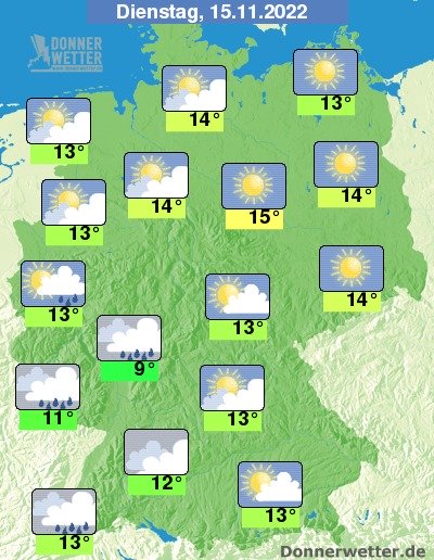 Am Dienstag ist es über den östlichen Landesteilen noch verbreitet heiter bis sonnig und trocken. Im übrigen Land ziehen dagegen meist viele und oft dichte Wolken durch, lokal fällt dazu etwas Regen. Die Temperatur erreicht 9 Grad am Westerwald und bis 15 Grad in der Magdeburger Börde.