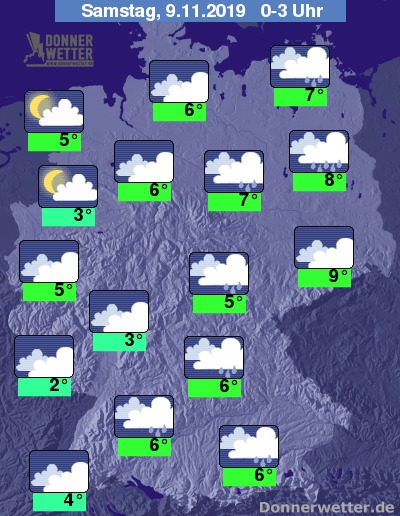 In der Nacht zeigt sich der Himmel über weiten Landesteilen stark bewölkt oder bedeckt, nur im äußersten Nordosten ist es überwiegend locker bewölkt. Vor allem in der Nord- und Osthälfte des Landes muss verbreitet mit Schauern gerechnet werden, während es in der Westhälfte meist trocken bleibt.