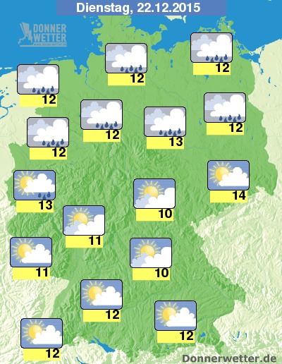Am Dienstag ziehen über den Norden verbreitet dichte Wolken hinweg, dazu fällt immer wieder teils kräftiger Regen. Auch über der breiten Mitte halten sich oft viele und teils dichte Wolken, hier fällt jedoch nur gebietsweise auch Regen. Im Süden ist es dagegen meist heiter oder aufgelockert bewölkt und dazu trocken. Die Temperatur steigt auf 10 Grad in Unterfranken und bis 13 Grad im Münsterland. Im Norden und Westen weht ein teils starker und in Böen stürmischer Wind, an der Nordsee herrscht Sturm, dabei sind schwere Sturmböen möglich.