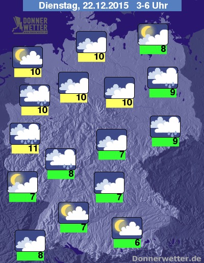 In der kommenden Nacht ist es im Süden der Republik meist locker oder aufgelockert bewölkt und trocken. Sonst halten sich zunächst weitgehend dichte Wolken, aus denen immer wieder, teils kräftiger Regen fällt. Gegen Morgen klingen die Niederschläge im Norden meist ab und hier und da kann die Bewölkung auch auflockern. Die Temperatur sinkt auf 11 Grad in Aachen und etwa 6 Grad in München. Im Norden weht starker und teils stürmischer Wind mit möglichen Sturmböen, an den Küsten und auf den Bergen herrscht Sturm, dabei sind orkanartige Böen möglich.