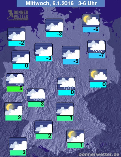 In der Nacht zum Mittwoch lockert die Bewölkung im Süden, Südwesten, in Sachsen, im Nordosten und im äußeren Norden gebietsweise auf, teils ist es hier auch stark bewölkt, jedoch weitgehend trocken. In einem breiten Streifen vom westlichen NRW bis in den Norden Bayerns fällt unter dichten Wolken immer wieder Regen, teils auch Schneeregen oder Schnee. Von der Landesmitte bis nach Berlin-Brandenburg fällt gebietsweise Schnee, dazu kann es vielerorts glatt auf den Straßen werden! Die Temperatur sinkt auf 5 Grad in Aachen und etwa -7 Grad im Raum Berlin. An der Nordsee weht zum Teil stürmischer Wind.