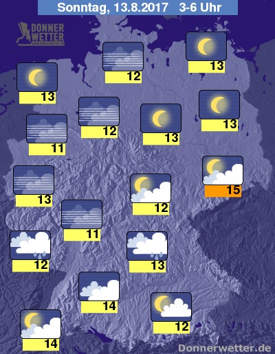In der Nacht zum Sonntag bleibt es über dem Süden der Republik häufig stark oder aufgelockert bewölkt, dazu kann hier und da auch Regen fallen. Weiter nach Norden hin ist es anfangs noch teils stärker bewölkt, jedoch klart der Himmel immer weiter auf und es bleibt trocken. Die Temperatur sinkt auf 15 Grad in Dresden und bis 11 Grad am Niederrhein.