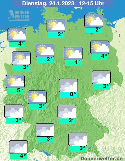 Heute Nachmittag zeigt sich vor allem im Norden, aber auch gebietsweise über dem Westen und dem Osten die Sonne. Vor allem über der Südhälfte bleibt die Wolkendecke überwiegend verschlossen und die Sonne zeigt sich nur selten. Oft ist es dazu auch neblig-trüb, jedoch trocken. Die Temperatur liegt bei 0 Grad im Vogtland und bis 5 Grad im Rheinland.
