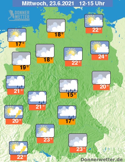 Heute Nachmittag ist es im über der Südhälfte oft stark bewölkt und es bilden sich regional Schauer, vom Ober- bis Mittelrhein sind auch Gewitter möglich. Im übrigen Land ist es teils locker, teils stark bewölkt, dabei bleibt es zumeist trocken. Die Temperatur steigt auf 15 Grad in Jena und bis 24 Grad in Berlin.