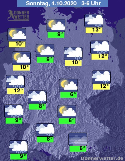 In der Nacht zum Sonntag ziehen dichte Wolken über den Norden und Osten hinweg, dabei fällt zeitweise Regen. Neuer Regen zieht im Nachtverlauf auch im Westen und Südwesten auf. Im übrigen Bundesgebiet ist es hingegen oft nur locker, teils auch stärker bewölkt, jedoch bleibt es weitgehend trocken. Die Temperatur sinkt auf 13 Grad in Rostock und bis 6 Grad im Münchner Umland.