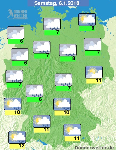 Am Samstag halten sich überwiegend dichte Wolken aus denen auch zeitweise Regen fällt. Im Süden und auch über Sachsen zeigt sich hingegen im Tagesverlauf häufig die Sonne und es ziehen hier mehrheitlich nur lockere bis aufgelockerte Wolken durch, dazu bleibt es hier meist trocken. Die Temperatur erreicht 6 bis 12 Grad.