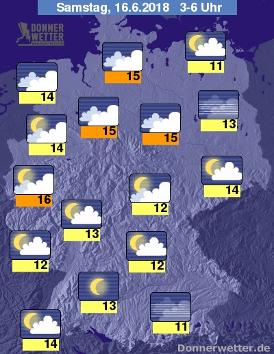 Am Samstag ist es im Süden und Osten meist heiter und trocken. Im übrigen Bundesgebiet ziehen im Tagesverlauf jedoch meist dichte Wolken durch, die hier und da Schauer und selten auch Gewitter bringen, sonst bleibt es weitgehend trocken. Die Temperatur erreicht 19 Grad an der Nordsee und bis 27 Grad in der Lausitz.