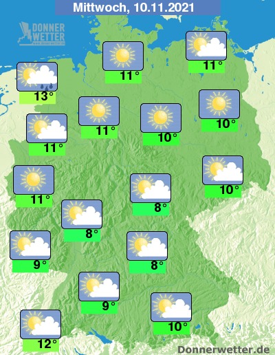 Am Mittwoch ist es oft heiter oder sonnig, teils ziehen einige Wolken durch. Im Süden und im Nordwesten ist es gebietsweise auch stark bewölkt oder trüb, an der Nordsee sind dazu einige Tropfen möglich, sonst dabei bleibt es aber trocken. Die Temperatur steigt auf 8 Grad in Mittelfranken und bis 13 Grad im nördlichen Emsland.