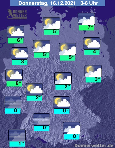 In der bevorstehenden Nacht zeigt sich der Himmel im Westen und Südwesten oft locker bewölkt oder sternenklar, sonst ist es hingegen mehrheitlich aufgelockert bis stark bewölkt. Es bildet sich stellenweise Nebel, dazu bleibt es trocken. Die Tiefstwerte liegen bei 7 Grad in Rostock und etwa 0 Grad in Saarbrücken.