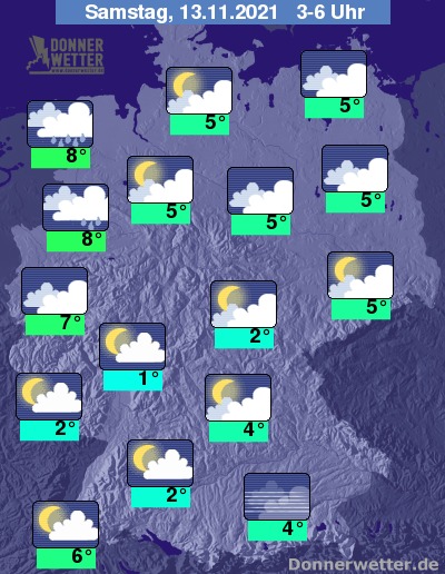In der kommenden Nacht bleibt es im Süden meist locker bewölkt oder sternenklar, sonst ist es schon meist stark und teils noch aufgelockert bewölkt und dazu trocken. Etwa gegen Mitternacht setzt vom Emsland bis zum Niederrhein Regen ein, der sich bis zum Morgen noch ein Stück weiter nach Osten ausdehnt. Die Temperatur sinkt auf 8 Grad an der Ems und bis 1 Grad am Westerwald.