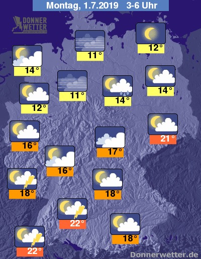 In der bevorstehenden Nacht bilden sich in einem breiten Streifen vom Südwesten bis nach Ostdeutschland gebietsweise einzelne Schauer und örtliche Gewitter, südöstlich davon ist es auch oft stark bewölkt, aber meist trocken. Nordwestlich des Streifens ist es hingegen meist nur locker bewölkt oder sternenklar und dazu trocken. Die Temperatur sinkt auf tropische 22 Grad in Stuttgart und auf deutlich kühlere 11 Grad in Hamburg.