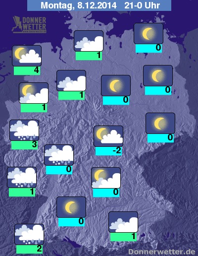 Heute Abend ziehen im Westen, und später auch im Südwesten dichte Wolken durch, die für zeitweiligen Regen-, Schneeregen- und Schneefall sorgen, sonst ist es dagegen oft aufgelockert bis stark bewölkt und trocken. Häufig sternenklar und trocken ist es im Nordosten und Osten des Landes. Die Abendtemperatur liegt bei 4 Grad an der Nordseeküste und um -2 Grad am Thüringer Wald.