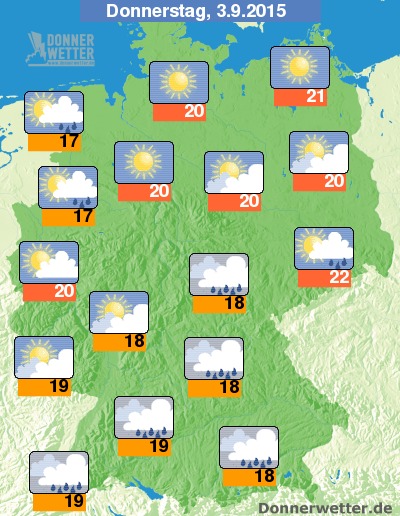 Heute bleibt es vor allem vom Süden bis in die Mitte Deutschlands meist stark bewölkt und es fällt zeitweise Regen. Auch über Sachsen kann es bei teils starker Bewölkung zeitweise regnen. Im Norden und Westen ist es zumeist heiter bis sonnig, jedoch sind im Nordwesten auch einzelne Schauer möglich, sonst bleibt es jedoch weitgehend trocken. Die Temperatur steigt auf 17 Grad an der niederländischen Grenze und bis 22 Grad in Niederschlesien.