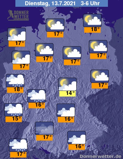 In der Nacht zum Dienstag bringen dichte Wolken entlang des Rheins zum Teil langanhaltenden und ergiebigen Regen. Im übrigen Süddeutschland ist es auch meist dicht bewölkt, aber trocken. Sonst ist es verbreitet aufgelockert bewölkt und dazu trocken. Die Temperatur sinkt auf 18 Grad im Rheinland und bis 14 Grad im Grabfeld.