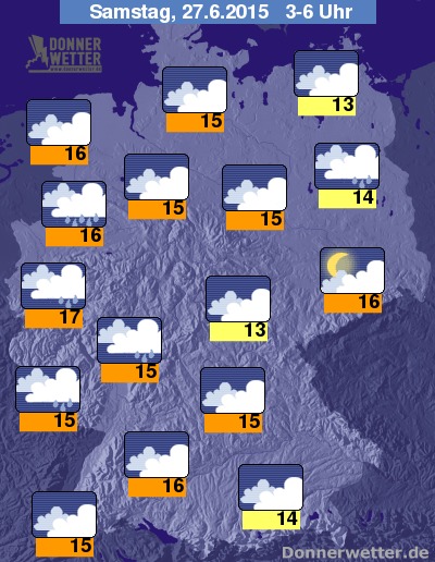 In der Nacht zum Samstag ziehen von Westen dichte Wolken durch und nachfolgend entwickeln sich zunächst im Westen, gegen Morgen auch im Südwesten, Nordwesten bis in die Mitte des Landes zum Teil kräftige Schauer und Gewitter. Im Norden, Osten und im äußeren Süden bleibt es bei wechselnder bis starker Bewölkung weitgehend trocken. Die Temperatur sinkt auf 17 Grad in Möchengladbach und bis 13 Grad im Grabfeld.