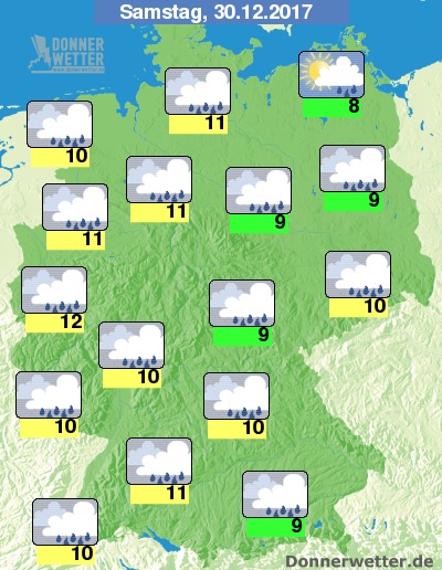 Am Samstag zieht aus Westen erneut, zum Teil auch kräftiger und langanhaltender Regen auf. Am Vormittag ist es zumindest im Osten und Nordosten meist trocken und an der Ostsee ist auch etwas Sonne möglich. Die Temperatur steigt auf deutlich mildere Werte zwischen 8 und 12 Grad. An der Nordsee weht ein teils stürmischer Wind.