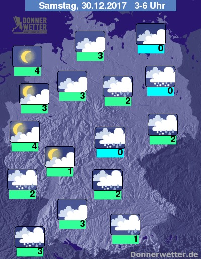 In der Nacht zum Samstag ziehen dichte Wolken mit Schnee, Schneeregen oder Regen weiter nach Osten und erreichen zum Morgen hin auch die östlichsten Landesteile. Es besteht häufig Glättegefahr! Nach Westen hin klingen die Niederschläge wieder ab und hier und da kann es auch etwas auflockern, oft bleibt es aber stark bewölkt. Die Temperatur sinkt auf 4 bis 0 Grad.