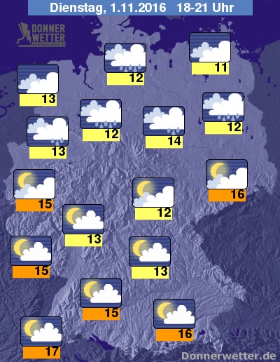 Heute Abend zeigt sich der Himmel über der Südhälfte Deutschlands oft locker bis aufgelockert bewölkt, dazu bleibt es trocken. In den nördlicher gelegenen Landesteilen halten sich dagegen größtenteils dichte Wolken und es fällt zeitweise Regen. Die Temperatur liegt anfangs bei 11 bis 17 Grad. In den Küstenregionen weht ein teils starker bis stürmischer Wind!