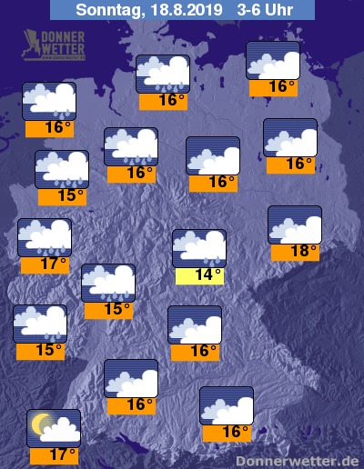In der folgenden Nacht bleibt der Himmel über dem Land weitgehend bedeckt, dazu bleibt es im Süden und Osten weitestgehend trocken, im übrigen Land fällt jedoch auch zeitweise Regen. Im Norden und Nordwesten bilden sich zum Teil kräftige Schauer. Die Temperatur sinkt auf milde 17 Grad in Köln und bis 14 Grad im Grabfeld.