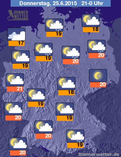 Heute Abend sind im Norden bei teils dichten Wolken noch einzelne Schauer, selten auch Gewitter möglich, häufig ist es hier aber auch gering oder aufgelockert bewölkt und trocken. Von der breiten Mitte bis in den Süden des Landes ist es überwiegend gering oder locker bewölkt und weitgehend trocken. Im Alpenvorland ziehen aber auch teils dichte Wolken auf und es sind einzelne Schauer möglich. Die Abendtemperatur liegt bei 21 Grad in der Kölner Bucht und etwa 17 Grad in Ostfriesland.