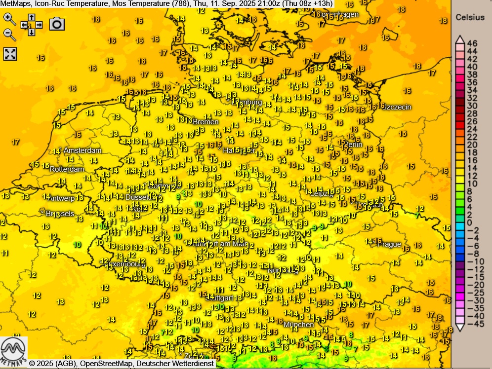 Die Wetterkarte mit den Drei-Stunden-Regenmengen bis 21:00 Uhr sowie die Lufttemperaturen in Deutschland nach ICON-RUC: