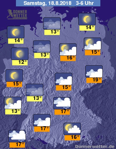 In der Nacht zum Samstag zeigt sich die Nordwesthälfte Deutschlands weitgehend sternenklar und dazu trocken. Im Süden und Osten hält sich dagegen ein meist geschlossene Wolkendecke aus der sich einzelne Schauer bilden können. Die Temperatur sinkt auf 19 Grad in Dresden und bis 12 Grad am Niederrhein.