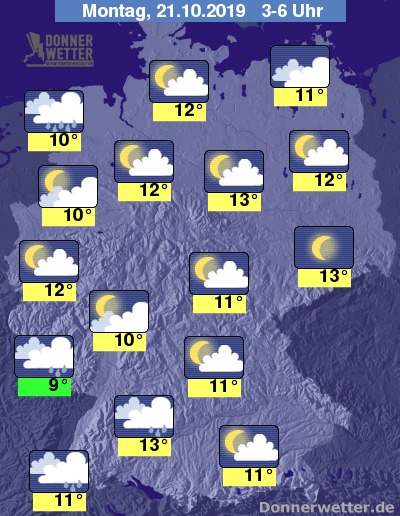 In der Nacht zum Montag fällt in den westlichen und nördlichen Landesteilen noch zeitweise Regen, der bis zum Morgen größtenteils abklingt oder abschwächt. Am Morgen regnet es dann nur noch im Nordseeumfeld und im Südwesten weiter. Im übrigen Bundesgebiet ist es meist locker bis aufgelockert bewölkt und trocken. Die Temperatur sinkt auf 13 Grad in Magdeburg und bis 9 Grad im Saargau.
