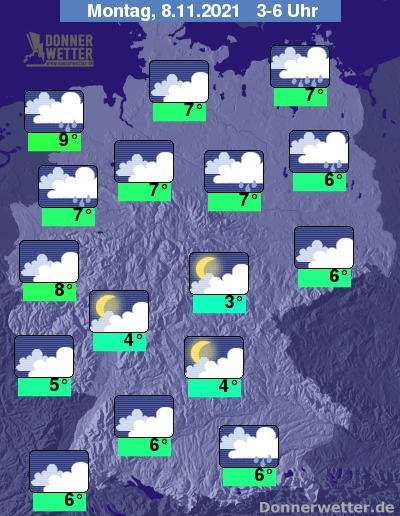 In der Nacht zum Montag zieht von Nordwesten her oft starke Bewölkung durch, dazwischen kann es aber auch hin und wieder etwas auflockern. Über der Südhälfte des Landes bleibt es weitgehend trocken, während sich weiter nach Norden hin gebietsweise Schauer bilden. Die Temperatur sinkt auf 9 Grad in Cuxhaven und bis 3 Grad in Erfurt. An den Küsten weht weiterhin ein oft stürmischer, im übrigen Norden ein teils starker Wind.